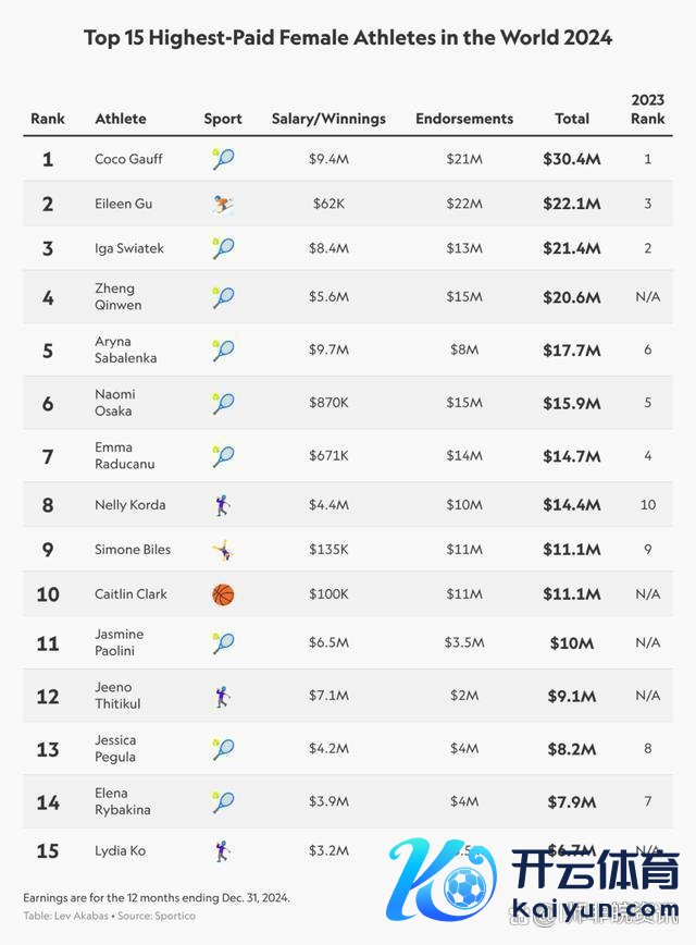 在营业价值方面,冰雪通晓一直难以与网球等热门式样相忘形,但谷爱凌的出现突破了这一僵局。看成榜单前15名中唯独的滑雪通晓员,她以2210万好意思元的年收入高居寰球第二位。值得珍贵的是,她的年度比赛奖金收入仅有6万2000好意思元,远低于其他通晓员。可是,这碰巧突显了她在场外营业收入上的坚硬实力。