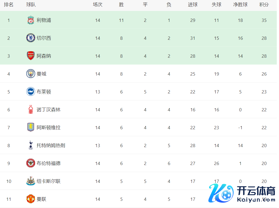 在积分榜上,利物浦以35分领跑。切尔西拿到28分,排行第2。阿森纳亦然28分,排行第3。曼城赢球之后,总积分是26分,排行升到第4。布莱顿以23分排行第5。曼联输球,总积分也曾是19分,排行掉到第11。