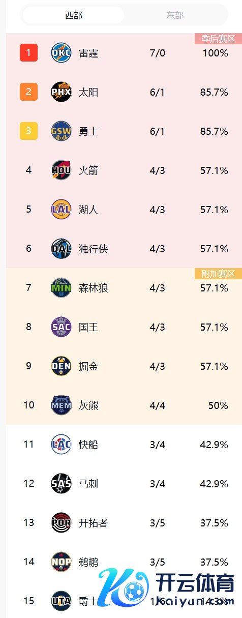本日比赛按捺后,雷霆7胜0负西部第1,太阳铁汉均为6胜1负分列西部2&3,三队暂列西部第1梯队。