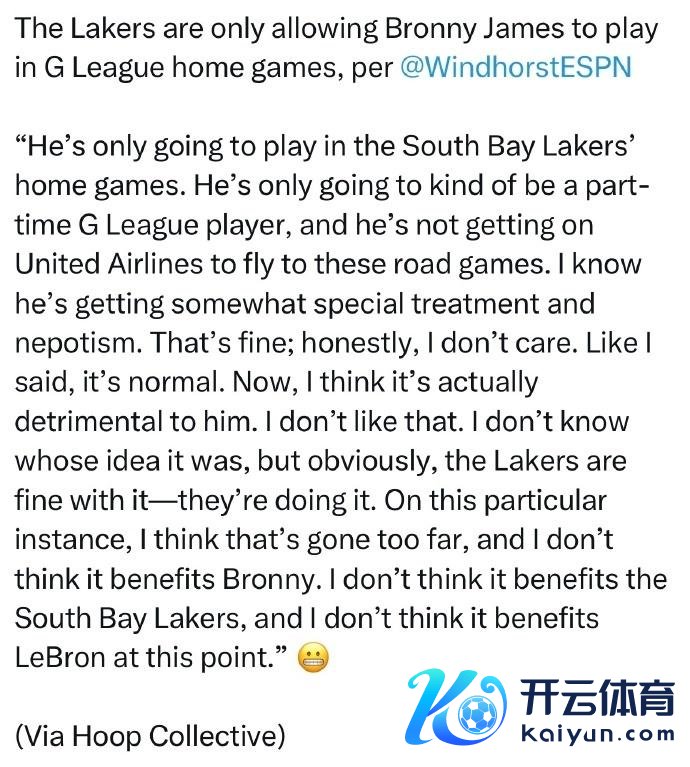 对此,ESPN名记Brian Windhorst报谈暗示:“布朗尼只会参加南湾湖东谈主的主场比赛,手脚一位兼职的发展定约球员,他不会乘坐飞机前去客场比赛。我知谈他因为裙带相干,取得一些颠倒待遇,这种情况很日常。毫无疑问,湖东谈主对此莫得任何见识,他们正在这么作念。”