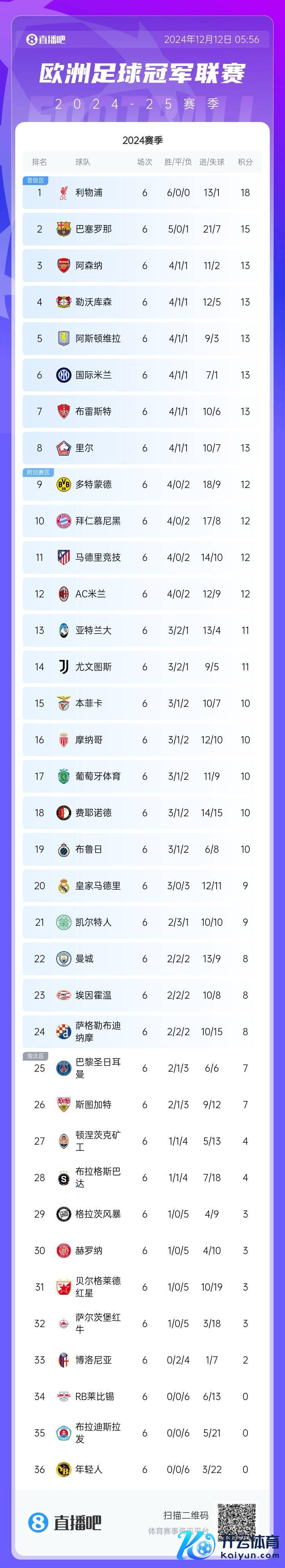 直播吧12月12日讯 欧冠联赛阶段第6轮戒指体育赛事直播,阿森纳3-0摩纳哥,曼城0-2尤文,维拉3-2莱比锡,利物浦1-0赫罗纳。