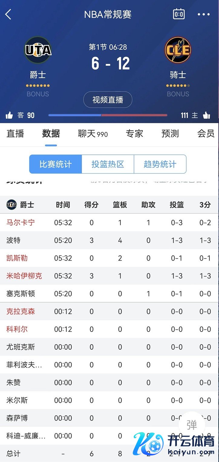 体育赛事直播 12月24日讯 NBA老例赛,骑士vs爵士。 第一节两边效果皆不高。首节快过半,两边得分为12-6。 其中骑士14中5,,三分6中1;爵士11中2,三分9中2。 体育赛事直播