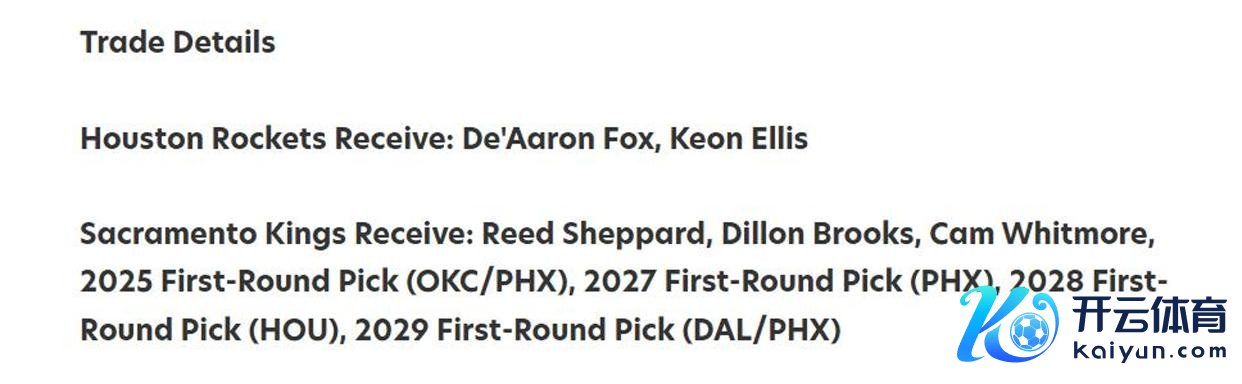 好意思国媒体《Fadeaway World》为休斯顿火箭队提供了一条勇猛的建议,提议了一项触及七名球员的来去决策,旨在匡助火箭队补强威望。凭据这份提议,火箭将赢得后劲新星福克斯与宿将埃利斯;而萨克拉门托国王则会经受谢泼德、狄龙以及惠特摩尔三位年青才俊,并畸形赢得将来四个选秀权——分离是2025年来自太阳队或雷霆队的首轮签、2027年太阳队的首轮签,以及2028年和2029年的首轮签,后者将从独行侠队或太阳队中产生。