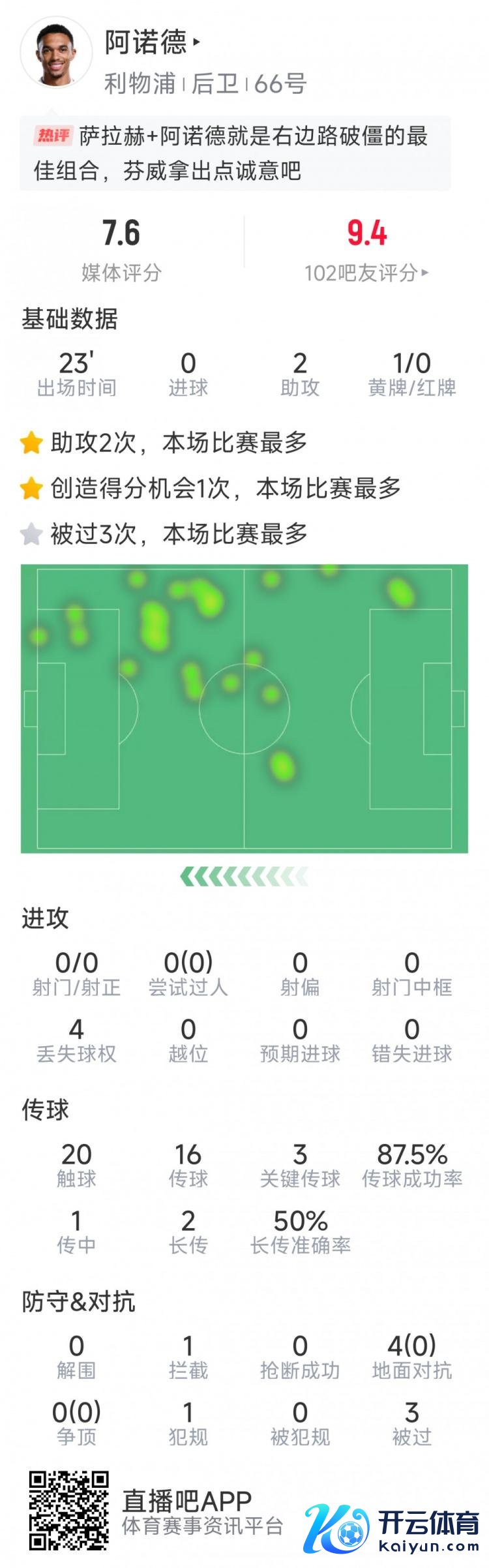 直播吧12月5日讯 在本轮英超体育最新信息,利物浦3-3战平纽卡,阿诺德替补登场送出2次助攻。以下为他在本场数据: