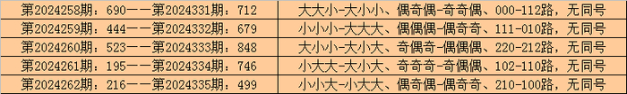 在成列三历史开奖中,第2024258期-第2024262期连结5期奖号为:690-444-523-195-216。