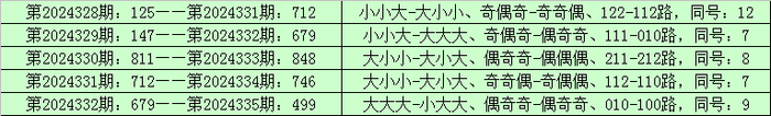 统计成列三已开出的奖号发现,在连结5期(第2024328期-第2024332)奖号为:125-147-811-712-679。