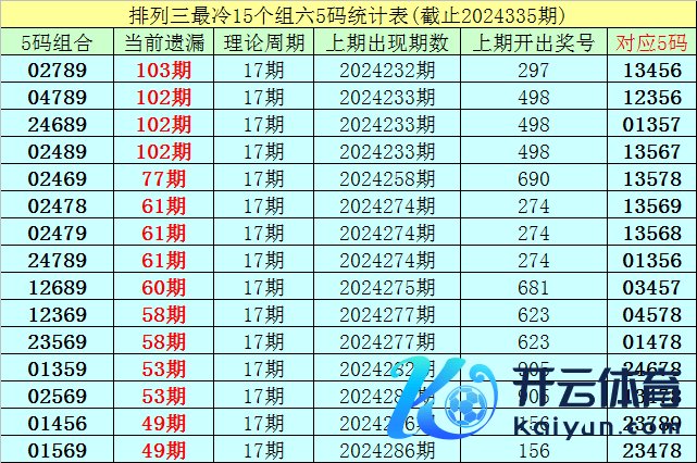 (5)胪列三现在遗漏值最大的5码组六组合为:02789,本期遗漏103期,短期解冻的可能性较小,则24336期奖号漫衍在02789-13456之中的可能性最大。