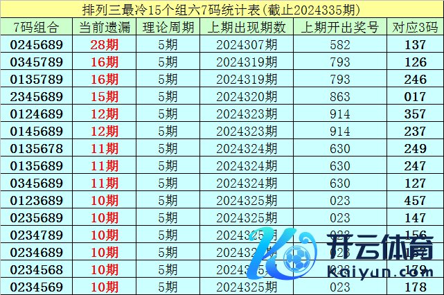 (1)在胪列三已开出的7107期奖号中(统计终局第2024335期),现在7码组六遗漏值最大的组合为:0245689,本期遗漏28期;